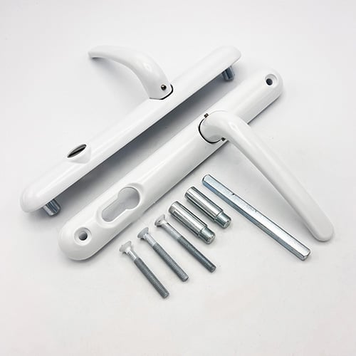 They are supplied as a pair complete with a pvc and composite spindle kit with fixing screws. Supplied with 2 small screws for standard thickness door and 1 Long/1 Medium screw with a set of longer reinforced bosses for thicker doors.
