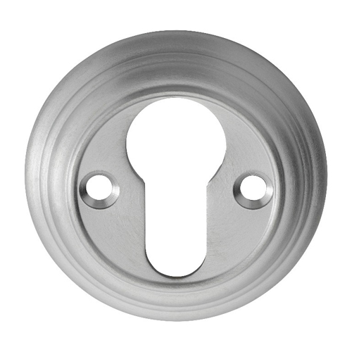 Euro lock profile, large diameter escutcheon with a contoured ringed circumference. Prominent rounded ridges encompass the keyhole and lend a distinctive style to this escutcheon and elevates it from the ordinary flat plate versions.