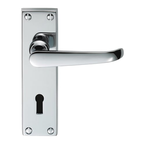 Lever on lock backplate. Standard profile 57mm c/c. A traditional Victorian styled handle on a standard plain rectangular backplate. A straight shaped lever which curves round at the end for easy ergonomic use. The heavy pattern design ensures that it wil