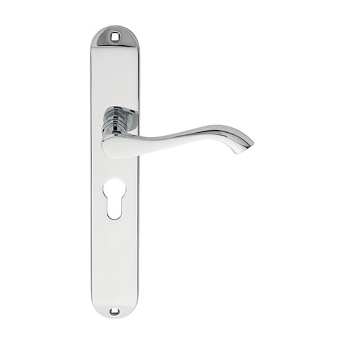 Lever on long lock backplate. Euro profile 47.5mm c/c. A solid curved sweeping lever on an elegant rounded backplate with a chamfered section at the top and bottom. The smooth and solid feel oozes quality making this a deluxe handle of choice. The other f