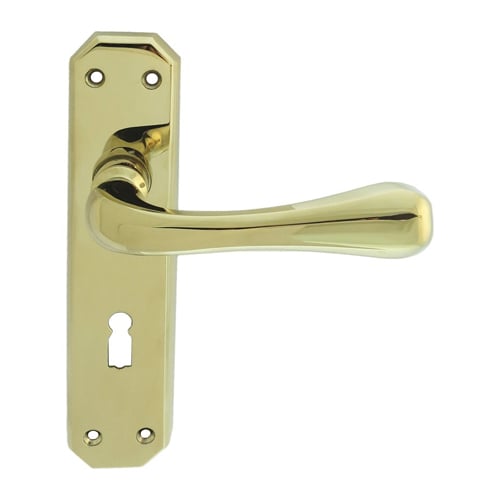 Lever on lock backplate. Standard profile 57mm c/c. A unique and distinctive geometric lever on a formed angular backplate. The shape of the lever itself is slim at the middle and chunky towards the end of the handle, allowing the user to grip it firmly w