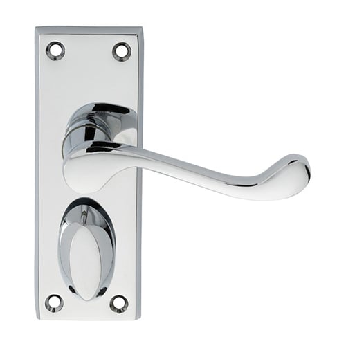 Lever on privacy backplate. A Victorian style upturned handle on a rectangular backplate. A plain and simple minimalist style. Privacy furniture is different from bathroom furniture as the turn mechanism engages a cam within the handle assembly locking th