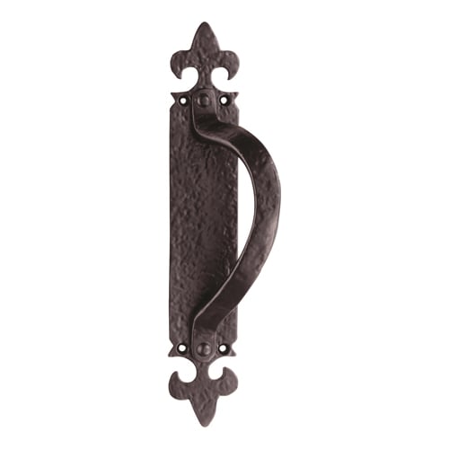 Black Antique large striking armorial offset pull handle in black antique on a fleur-de-lys backplate . Right hand version. This impressive pull handle has a grandiose, prominent look about it. Ideally suited to a large wooden door on a country home or ba