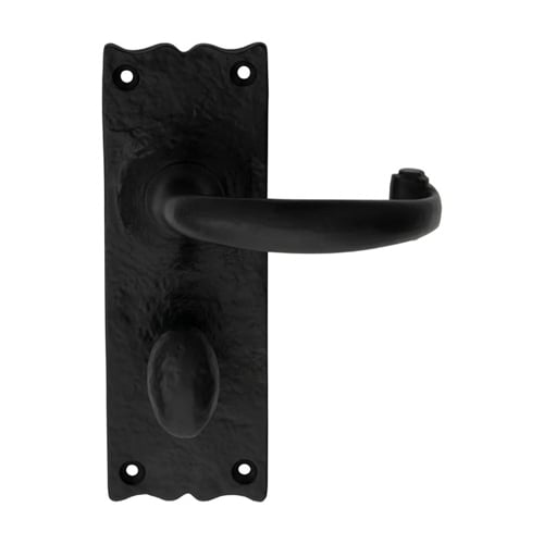 Black Antique lever on bathroom backplate. An elegant and traditionally designed inward curved handle, ending with a wrapped flange flourish. The decorative backplate with undulating edging top and bottom give a softer traditional appearance to the door h