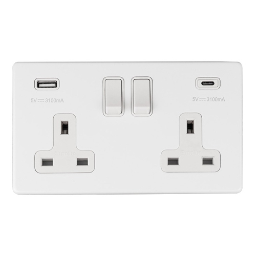 2 gang 13Amp Switched Socket With 3.1Amp USB Outlet (1x Type A, 1x Type C). Flat concealed Plate White with Matching Rockers.