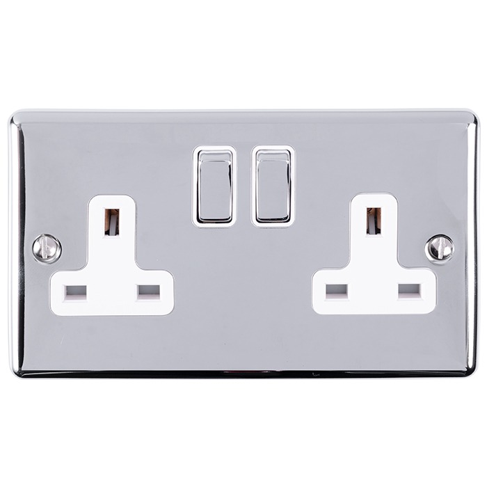 2 Gang 13Amp DP Switched Socket Polished Chrome Enhance Range White Trim