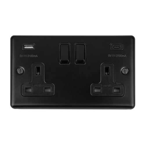 2 Gang 13Amp Switched Socket With 3.1Amp USB Outlet (1x Type A, 1x Type C). Black Nickel with Black trim and Matching Rockers