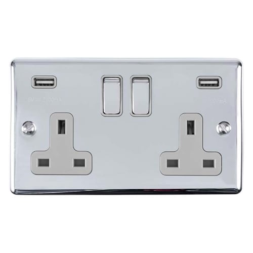 2 GANG 13AMP SWITCHED SOCKET WITH COMB 3.1 AMP USB OUTLETS POLISHED CHROME ENHANCE RANGE GREY TRIM