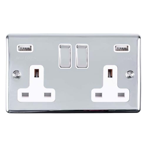 2 Gang 13Amp Switched Socket With Comb 3.1 Amp Usb Outlets Polished Chrome Enhance Range White Trim
