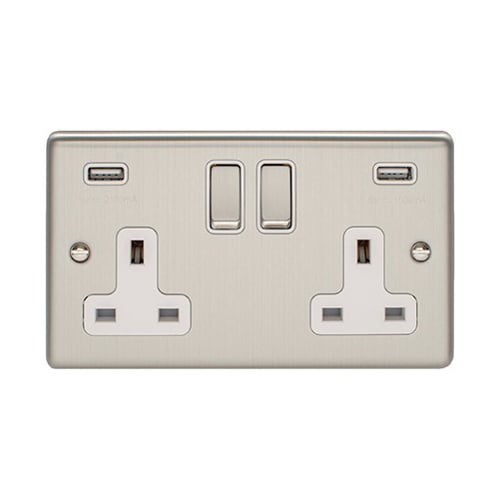 2 Gang 13Amp Switched Socket With Comb 3.1 Amp Usb Outlets Satin Enhance Range White Trim