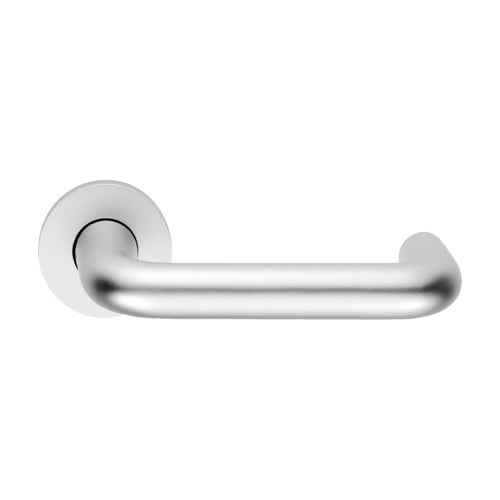A substantial 22 Dia. round bar safety lever on a concealed fix press on round sprung rose. The handle returns back to the door offering reduced risk of catching clothes or injury. DDA Compliant. Certified to British Standards BS EN 1906 and BS8300 desig
