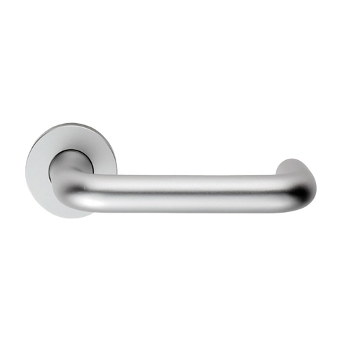 A sturdy 19m Dia. round bar safety lever on a concealed fix press on round sprung rose. The handle returns back to the door offering reduced risk of catching clothes or injury. DDA Compliant. Certified to British Standards BS EN 1906 and BS8300 designed t