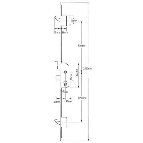 The lock features 72mm centres and the case measures 173mm by 55mm. The locks are only available with a 55mm backset and a flat 25mm faceplate with square ends.