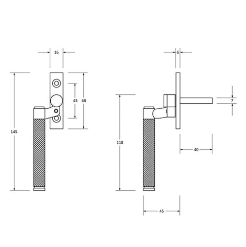 The product is handed and therefore care needs to be taken when choosing the correct hand. From the inside view, if your window is hinged on the left then a left-hand fastener is required. They have a 7mm x 40mm spindle and can be locked by way of a grub screw. Suitable for use with an espagnolette gearbox and window lock.