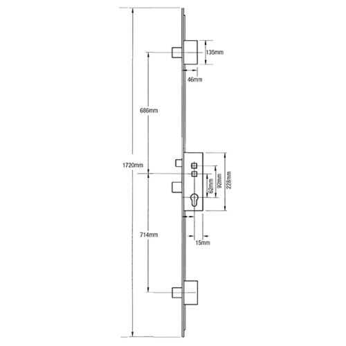 Crimebeater locks can also be verified by checking the measurements of the external deadbolts and hookbolts. The top hook or deadbolt will measure 686mm from the top spindle in the gearbox. The bottom hook or deadbolt will measure 714mm to the top spindle.