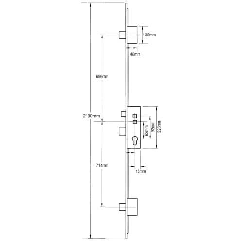 Crimebeater locks can also be verified by checking the measurements of the external deadbolts and hookbolts. The top hook or deadbolt will measure 686mm from the top spindle in the gearbox. The bottom hook or deadbolt will measure 714mm to the top spindle.