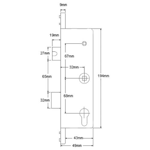 All SL16 gearboxes feature a 68mm centres (PZ) measurement. This is only found on Fullex locks (the FULCCA also has this measurement). The overall case height is 194mm. The case width is the backset + 15mm. The latch is 27mm high, the deadbolt is 32mm high and the distance between the bottom of the latch and the top of the deadbolt is 65mm.