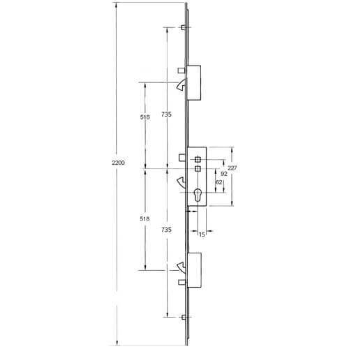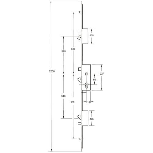 Fullex XL Latch 3 Hooks 2 Anti Lift Pins 2 Rollers Multipoint Door Lock – Option 1 (top hook to spindle = 518mm)