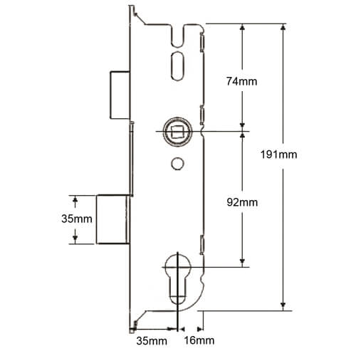 GU multipoint lock gearboxes measure 191mm high (excluding the fixing lugs) by the backset + 16mm wide. They are fixed to their faceplates with 3 screws. The distance from the top to the middle screw is 108mm, while the middle screw to the bottom screw is 92mm.