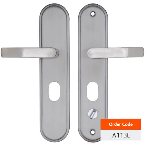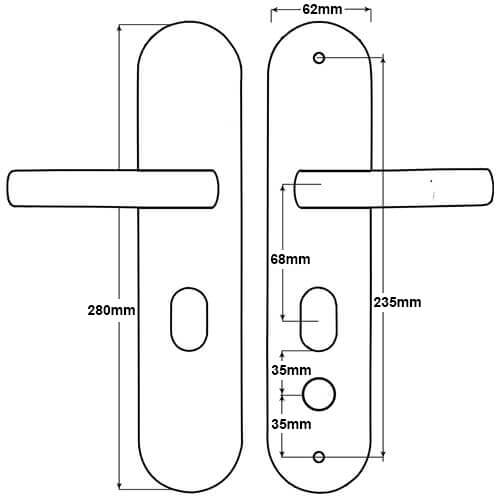Hooply steel door handle features a bolt through with snib, large oval cut also takes a euro cylinder and supplied with fixings and mounting gaskets.