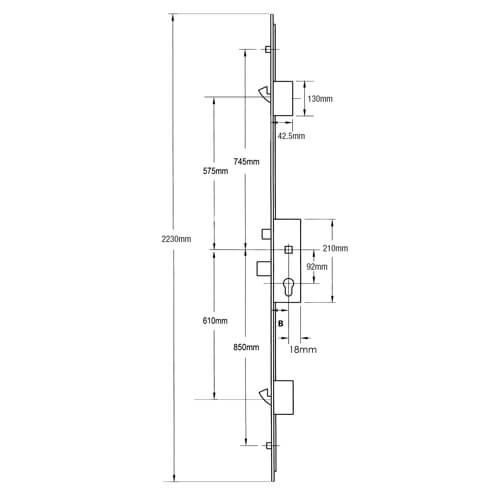 The overall height of the gearbox is 210mm, the bolt throws 21mm and the distance from the bottom of the latch to the top of the deadbolt is 56mm. The distance from the spindle to the top of the case is 85mm but the gearbox has both a hole and a groove to accept bolt through handle fixings.