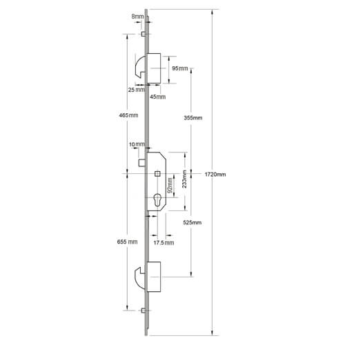This Mila Barratt Homes multipoint door lock features 2 Rollers 2 Hooks & 1 Latch.