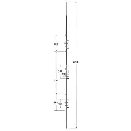 Milamaster gearboxes measure 228mm high by backset +15mm. The latch measures 30mm high, as does the deadbolt. There is 65mm between the bottom of the latch and the top of the deadbolt.