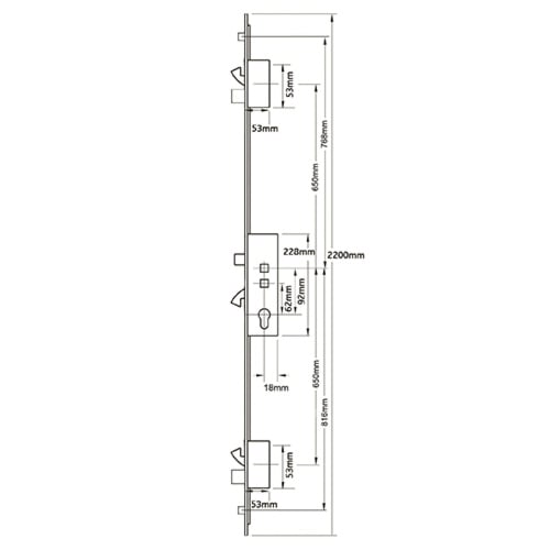Mantis 3 gearboxes measure 228mm high by 50mm wide. Hookbolt versions feature a central hook bolt that throws downwards and is 30mm high and a latch which measures 30mm high. There is 78mm between the bottom of the latch and the top of the hook. The deadbolt version has the same measurements but features a deadbolt instead of a hookbolt.