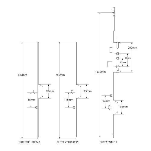 Many Elite locks are available in standard and compact versions designed for shorter doors. They feature the same 950mm handle height but a shorter overall length of 1810mm.
