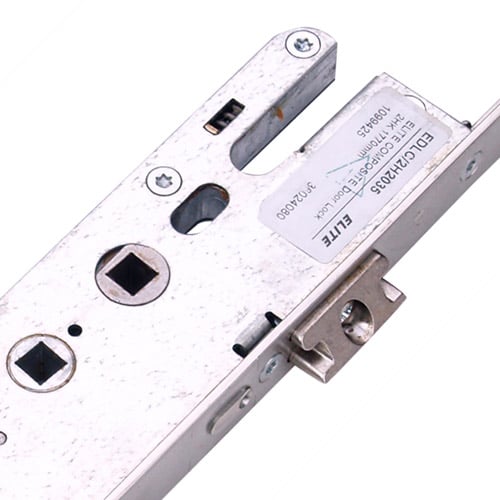 Identifying an Elite lock starts with the faceplate, which should be stamped with an Elite logo. This gearbox features a slot and a small hole below the slot appearing above the top spindle which is a piercing for bolt through handles.