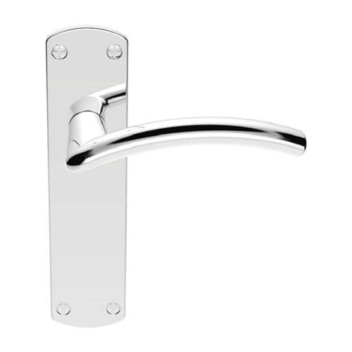 Lever on latch backplate. An arched flat style lever with a curved top and bottom. A simple elegant designer door handle, sleek and curved lines offer both comfort and visual appeal. Comes with a 10 year mechanical guarantee and is Fire door rated. Suitab