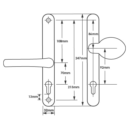 This handle has a backplate measuring 247mm and screw centres measuring 215mm. It is a durable and reliable handle, The handles have undergonecycle testing of over 50,000 operations. The polished chrome, silver and polished brass finish has undergone salt spray testing for over 240 Hours.