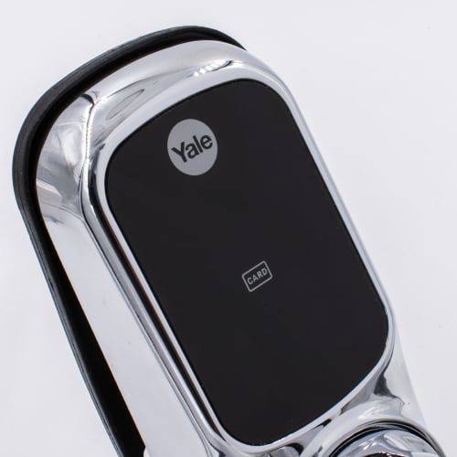 The Yale Keyless Non-Connected Electronic digital lock is a simple and convenient way to replace a keyed rim cylinder with a battery powered touch screen digital lock. The Brass version does not include any of the connected features above such as temporary pin numbers, connectivity to other devices such as smart phones, or a built in proximity reader for use with cards or fobs. These features are only available on the chrome version. The brass version will allow a maximum of two unique user codes.